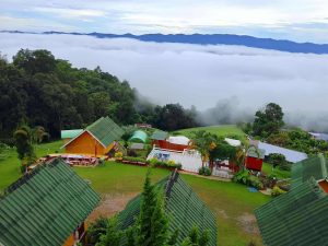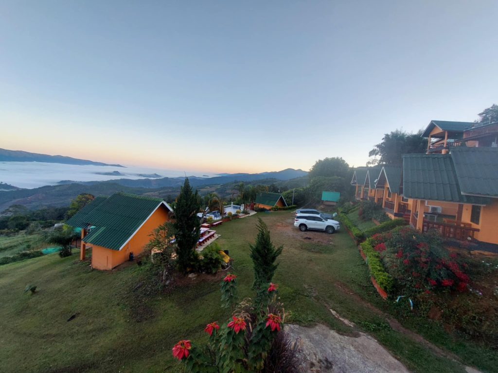 บ้านพักเล่นระดับ ทำให้มองเห็นวิวทะเลหมอกได้ทุกหลัง มีสนามหญ้าให้เดินเล่น